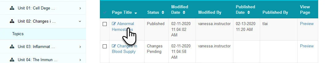 From your list of course content, click on the page title of any of your listed course pages to edit it. Note: It is recommended that you edit one page at a time and in one browser tab at a time. Having multiple editing tabs may lead to duplication or loss of edits.