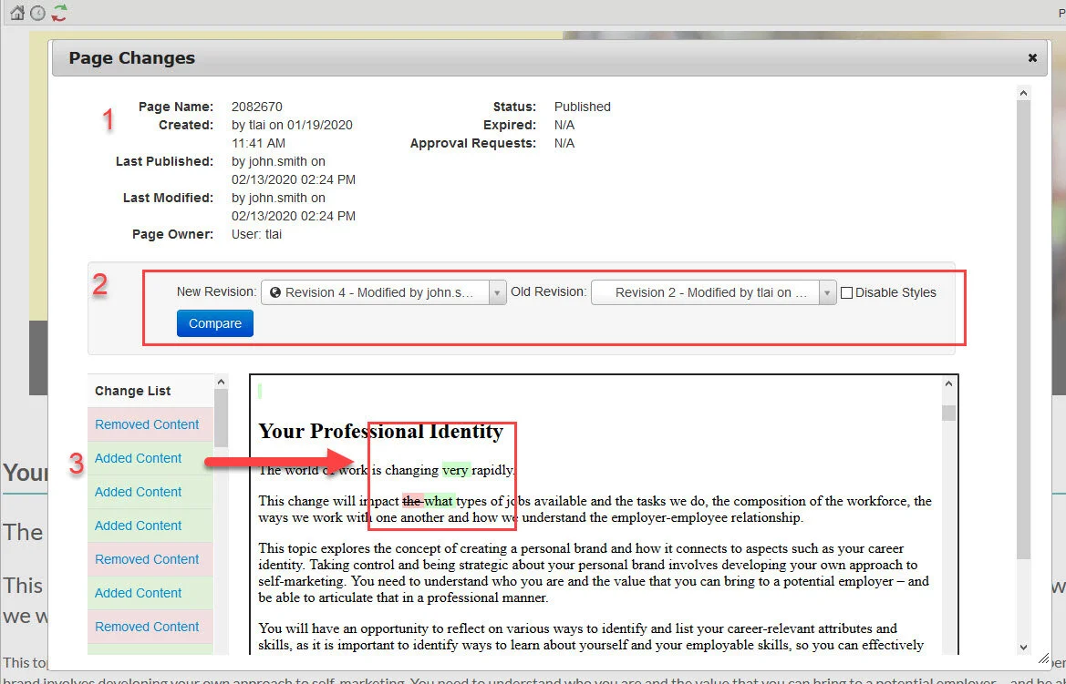 Page Changes: allows a user to compare the saved versions. This page is made up of three sections: