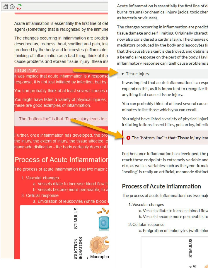 Below is an illustration of how a single page looks in i:Create and in CourseLink. On the left you see the page in the i:Create editor, with text blocks highlighted in red. On the right you see the page as it appears in CourseLink once published.