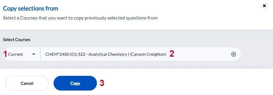 To start, select the course you wish to add your pre-selected QP question to, the select Copy selections from. This will open a popup window.
