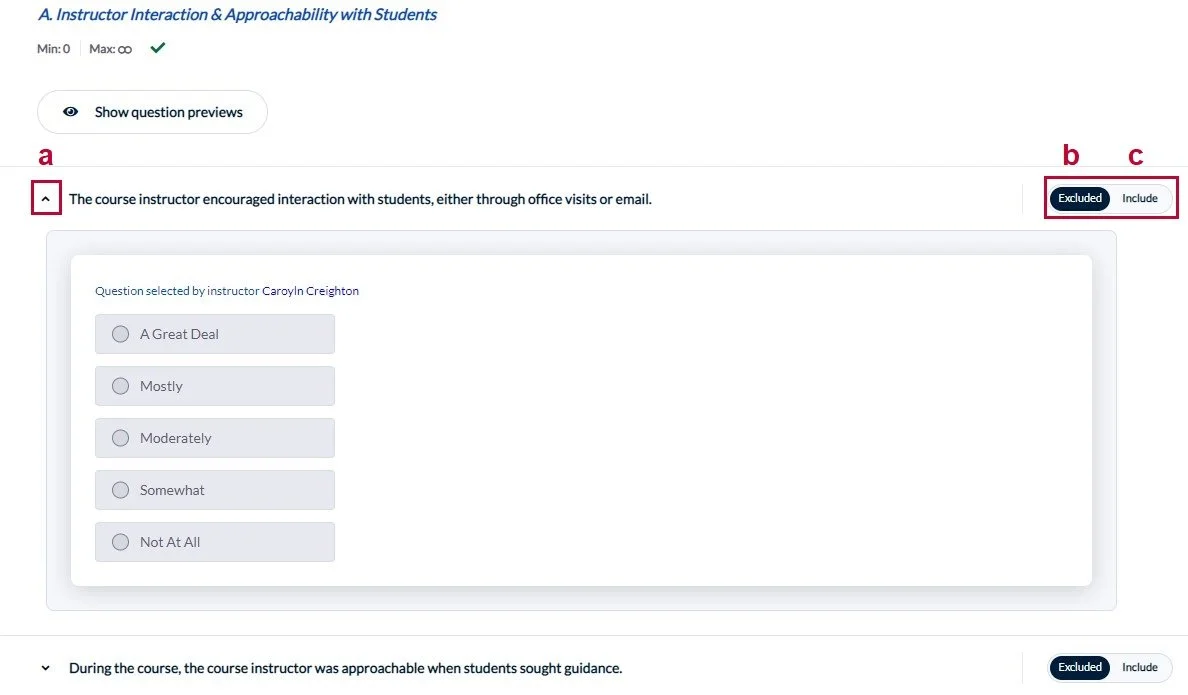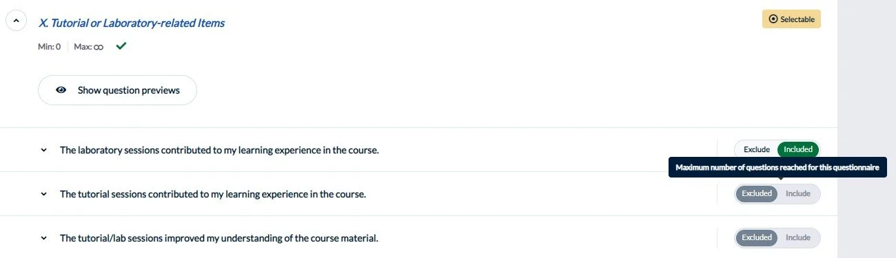 - Viewing options: Allows you to filter the questions to view all or a subset (e.g., included questions or excluded questions.