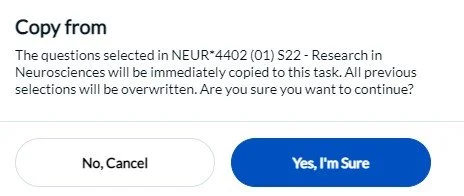 If you are teaching multiple courses in a semester and/or wish to reuse questions from a previous course, you can use the copy function to streamline the QP process. Both copying options are available to select from the top right of the question personalization page for an individual course.